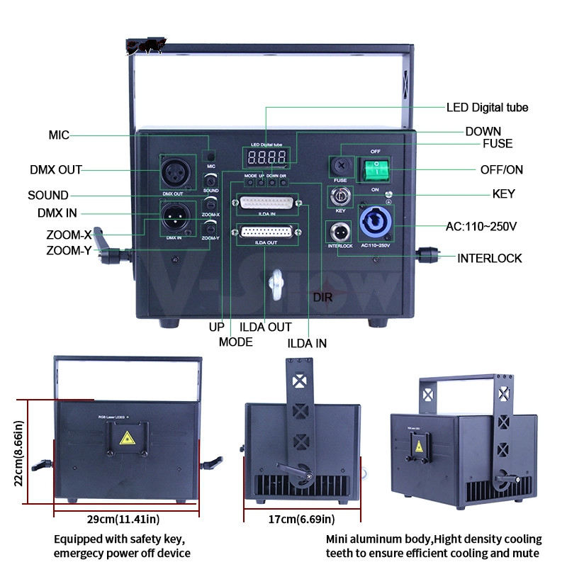 Puissance de laser:3W(G:520 700mw/R:638-800mw B:450 1.5W)
