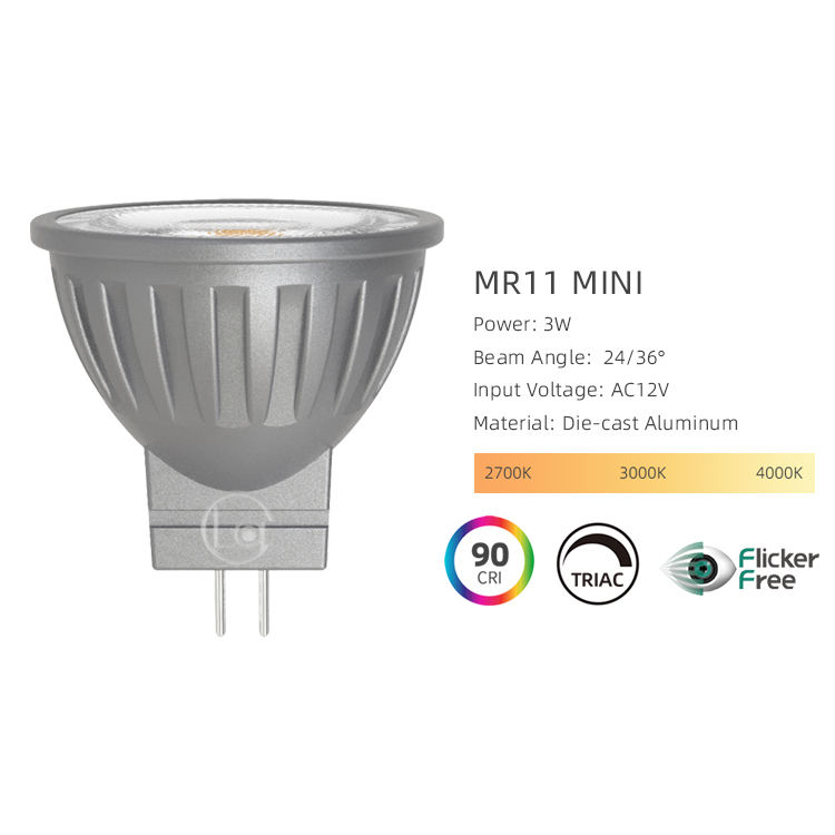 Ampoule LED 3W MR11 35mm 12V RA90 36 ° Beam Triac Dimmable Aluminium GU4 Spot LED pour éclairage intérieur extérieur