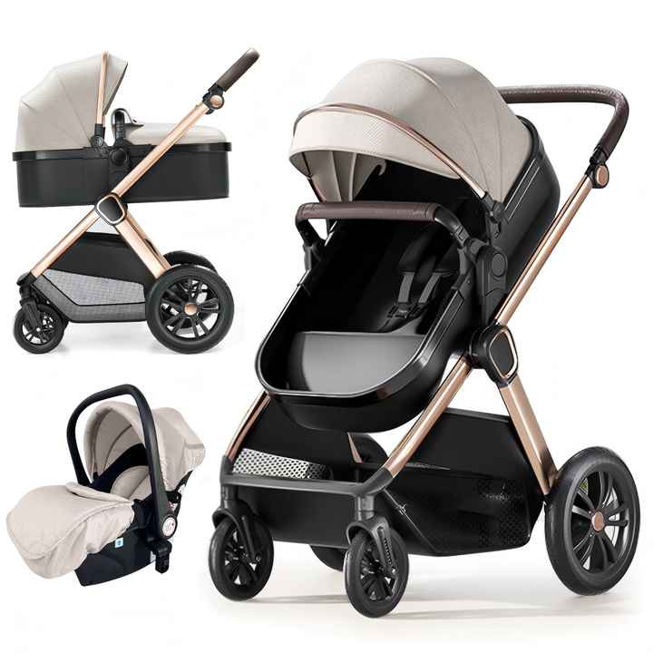 Poussette 3-en-1 haut de gamme pour bébé, avec nacelle, pliable bidirectionnelle et double freinage en une seule étape, pour enfants