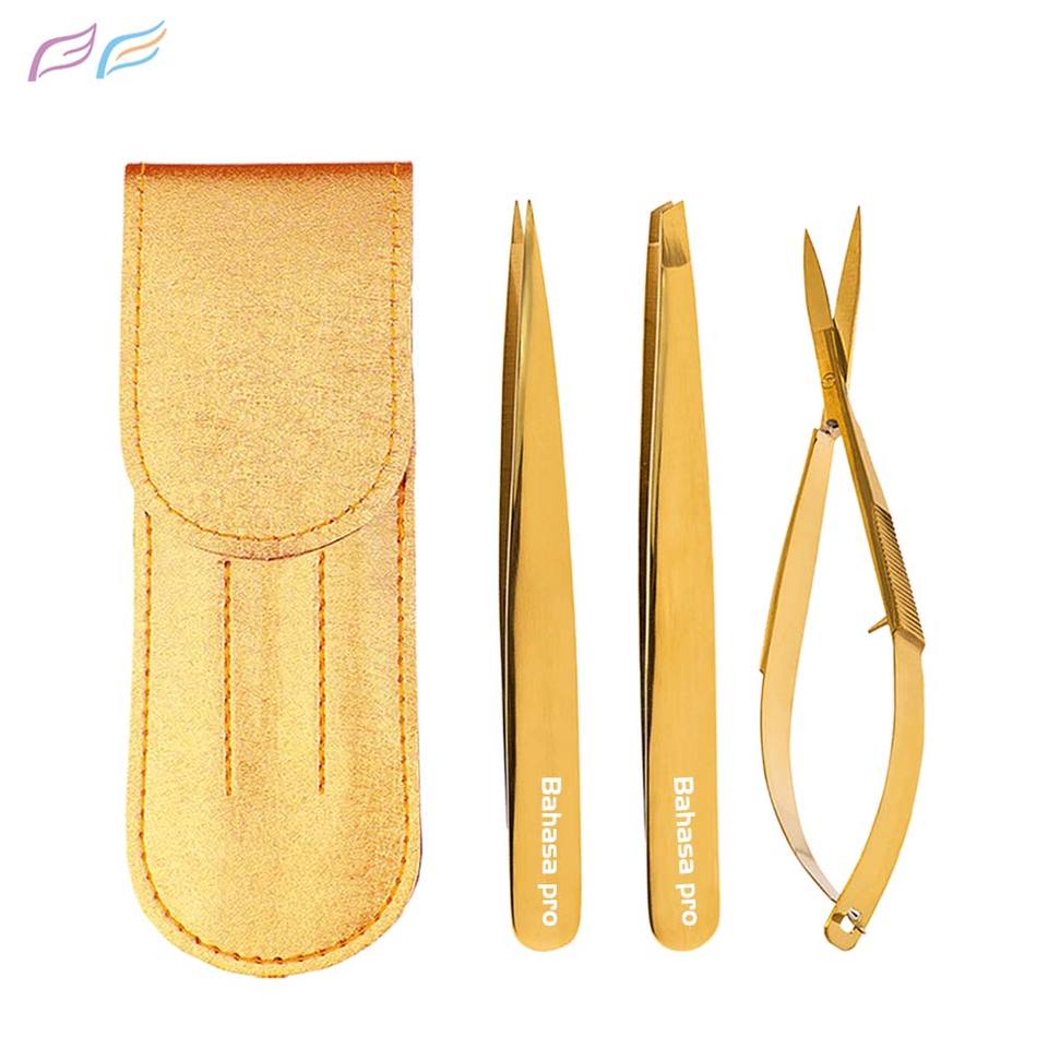 3pcs Plasma Gold Slanted Eyebrow Tweezers and Spring Scissors Set for Hair Removal Beauty Use With Custom PU Pouch
