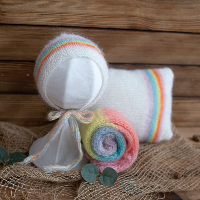 Ensemble de 3 pièces pour bébé, fille, garçon, chapeau arc-en-ciel, pantalon et oreiller, tricoté à la main, tenue de photo pour nouveau-né, bonnet de costume pour bébé