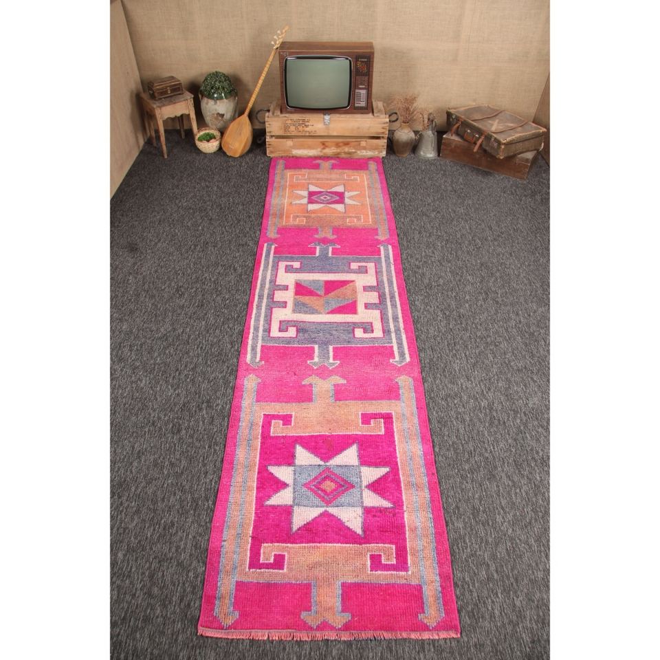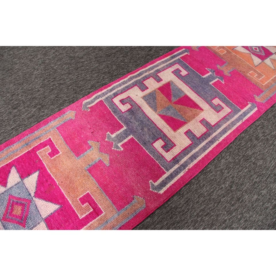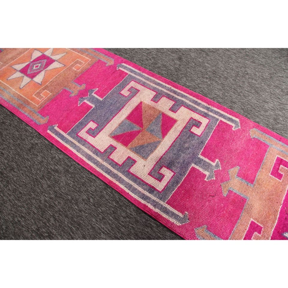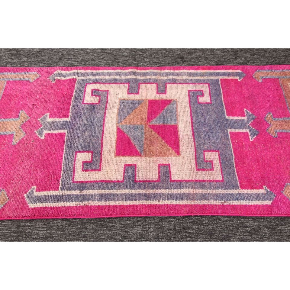 Tapis 3x11,5 pieds, tapis turc vintage, tapis géométrique rose