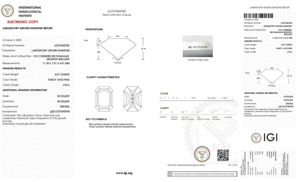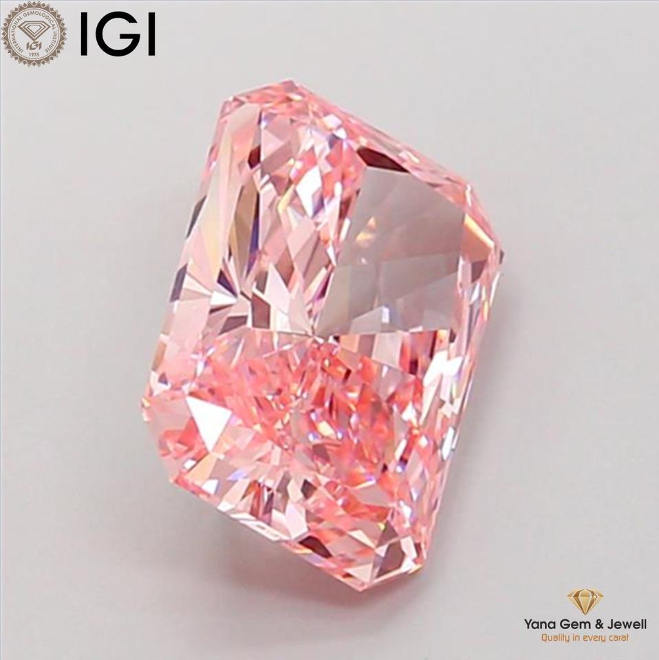 Diamant de laboratoire cultivé CVD de 4,01 carats, taille Radiant, couleur Fancy Vivid Pink, clarté VVS2, avec certificat IGI, pour création sur mesure