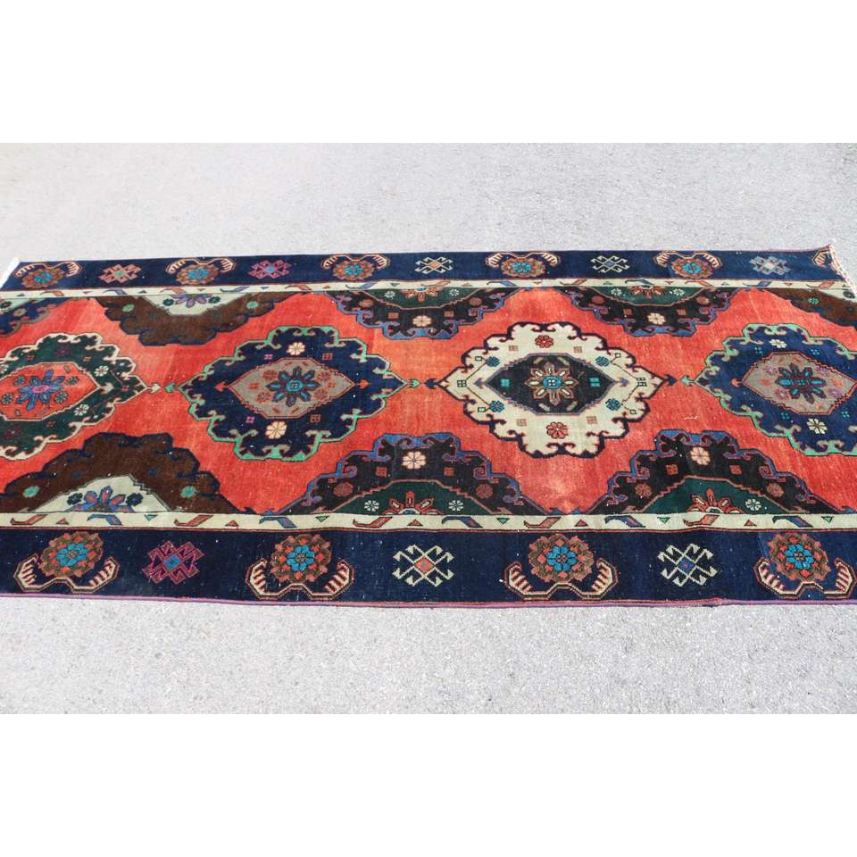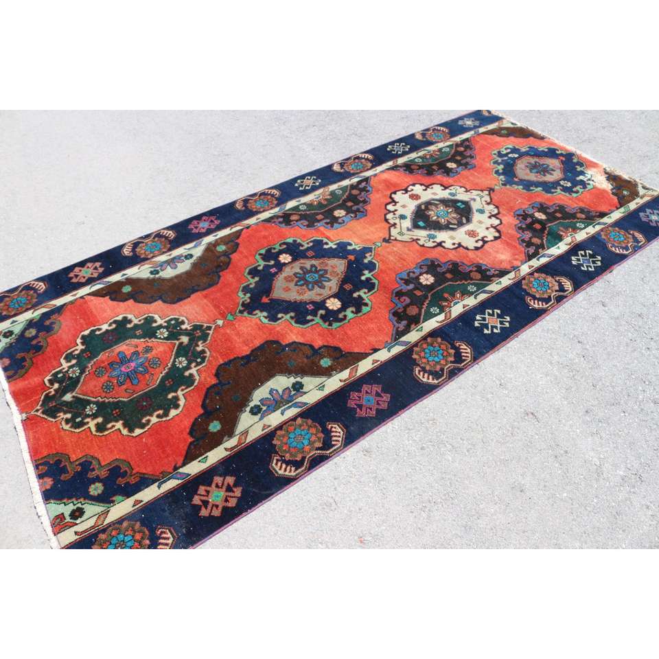 Tapis turc de 4,1 x 9 pieds, tapis vintage, tapis en laine rouge et bleu à motifs floraux