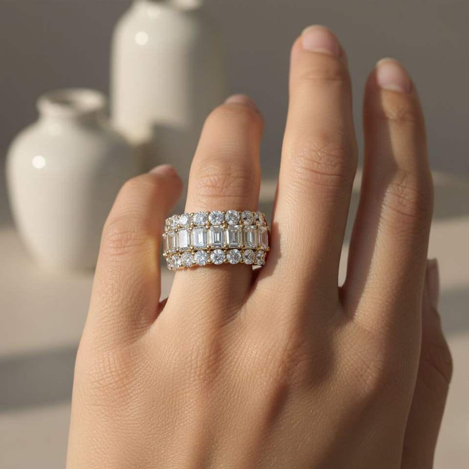 Bague Statement Triple Rangée avec Émeraudes Rondes Mixtes 4.30 CTW
