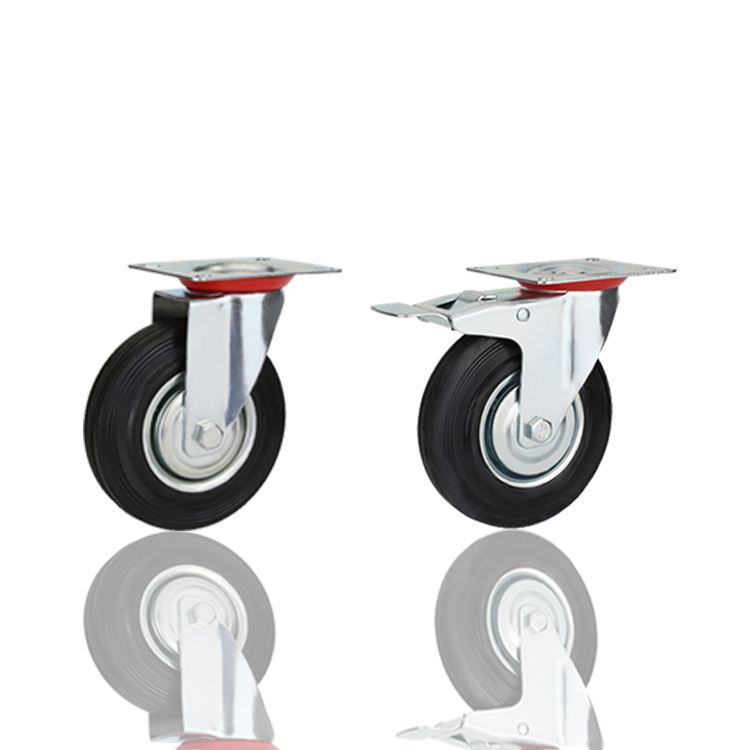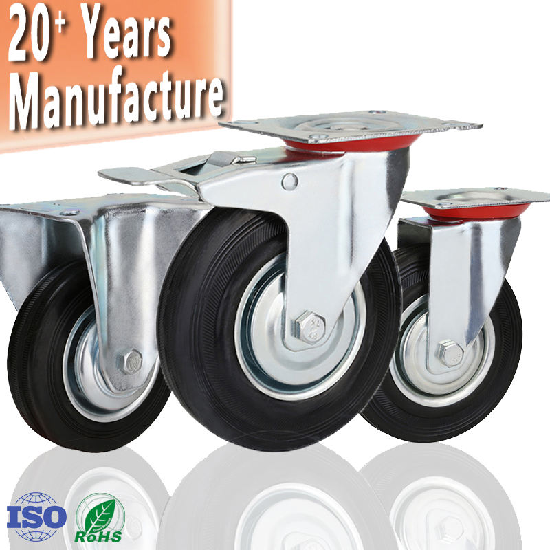 Roues de chariot industrielles pivotantes avec frein, en caoutchouc massif, plaquées zinc, avec plaque supérieure de 4, 5, 6, 8 pouces