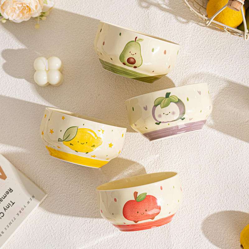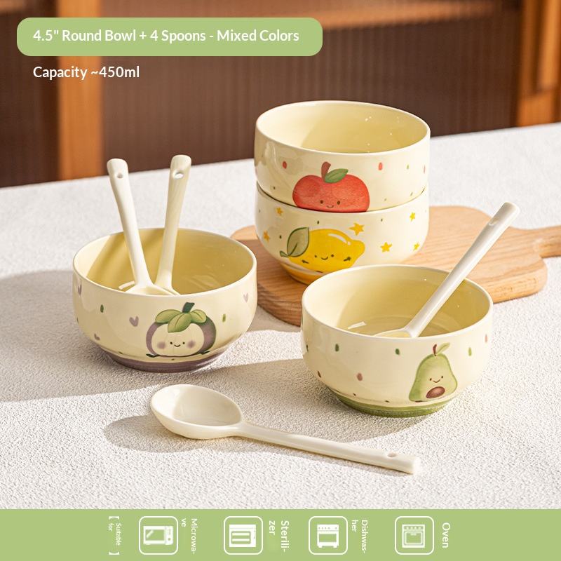 Bol en céramique sous-glaçurée de 4,5 pouces, série Fruits Mignons, design esthétique, avec cuillère assortie pour le petit-déjeuner et les collations