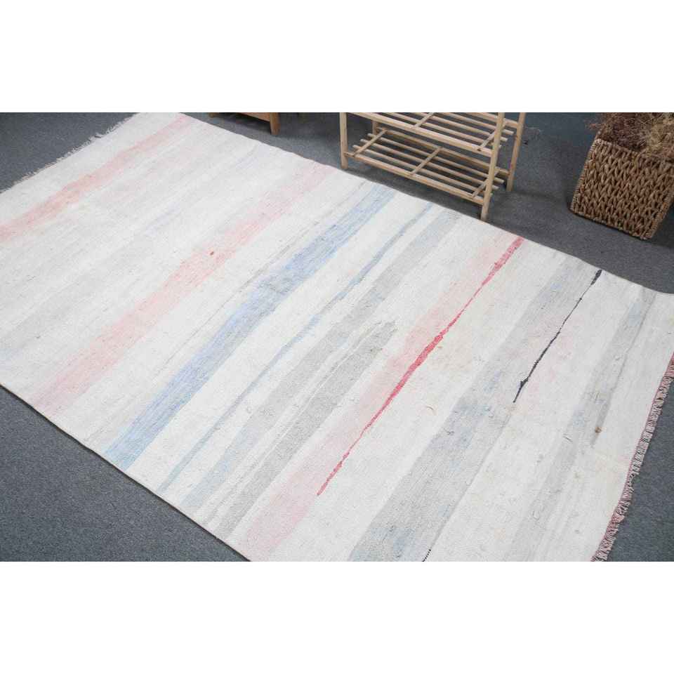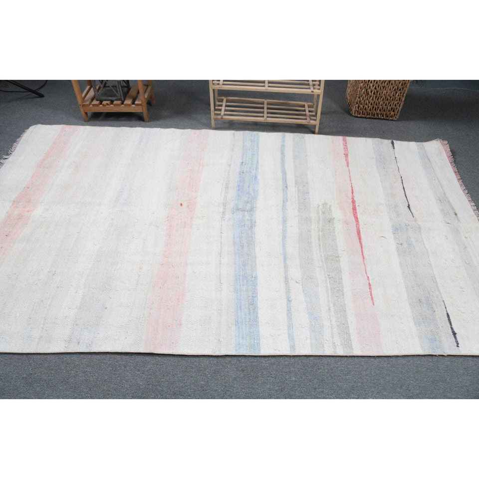 Tapis vintage 4,9 x 8,2 pieds, grand tapis turc, tapis oriental blanc et rose