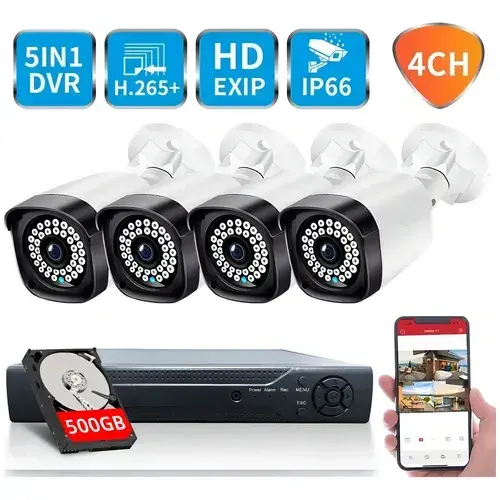 Système de caméra de sécurité 4 canaux 2MP avec disque dur 500 Go, vision nocturne, étanche, détection de mouvement, kit de surveillance extérieur