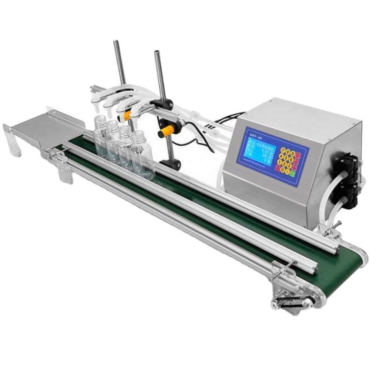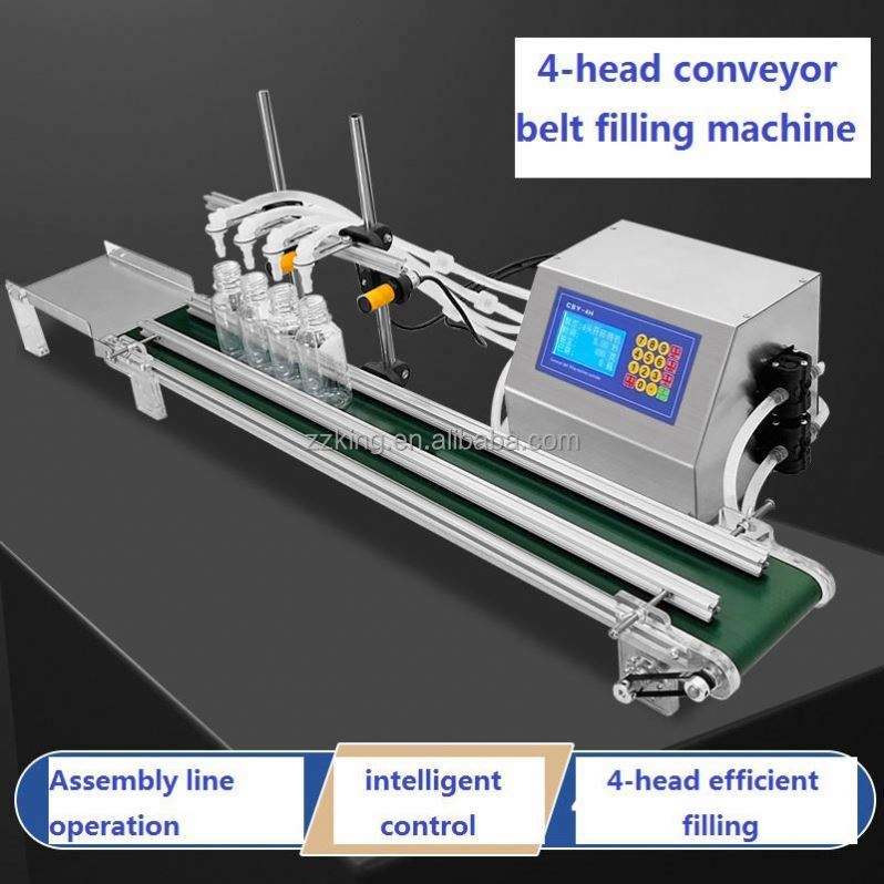 Machine de remplissage semi-automatique de bureau à 4 têtes pour bouteilles en plastique et en verre, liquides et huiles, avec convoyeur, pour boissons et jus