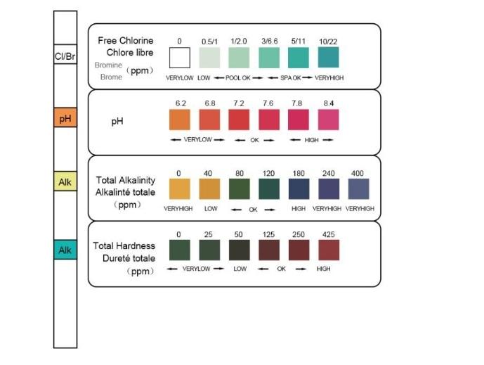 Portée de test:Brome/chlore résiduel, PH, alcalinité totale, dureté totale