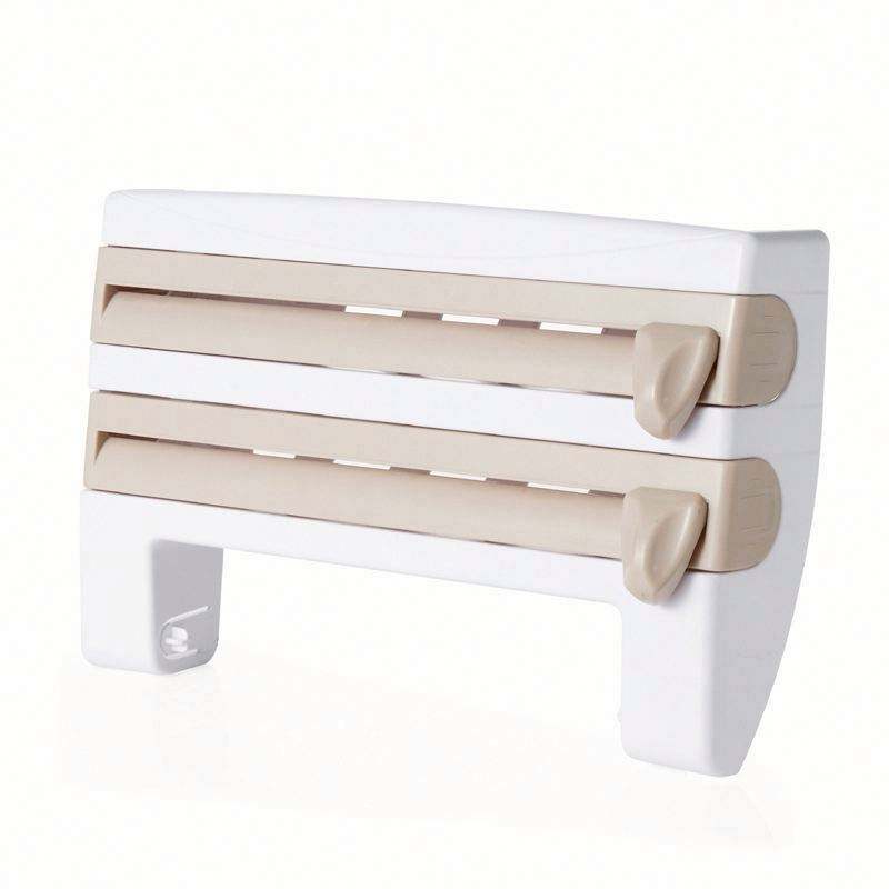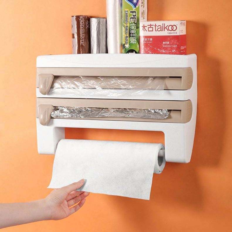 Support mural 4-en-1 pour film alimentaire, coupe-film, essuie-tout et outils de nettoyage, 2 niveaux