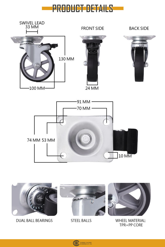 Nom du produit:Roue pivotante et frein en caoutchouc TPR solide de 4 pouces, plaque pivotante supérieure