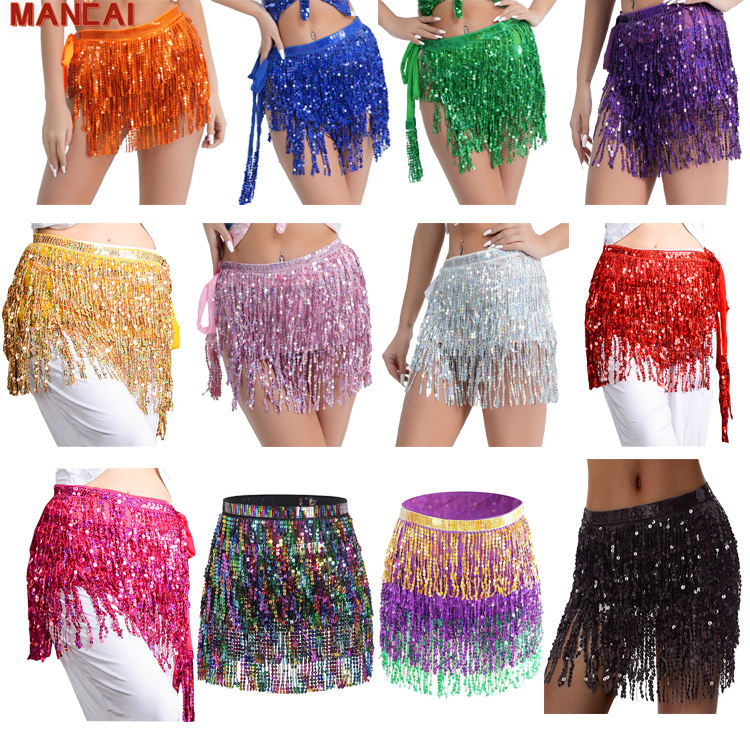 Mini-jupe de danse latine à 4 couches, robe de danse du ventre, chaîne de taille, paillettes multicolores, franges, écharpe de hanche, performance sur scène