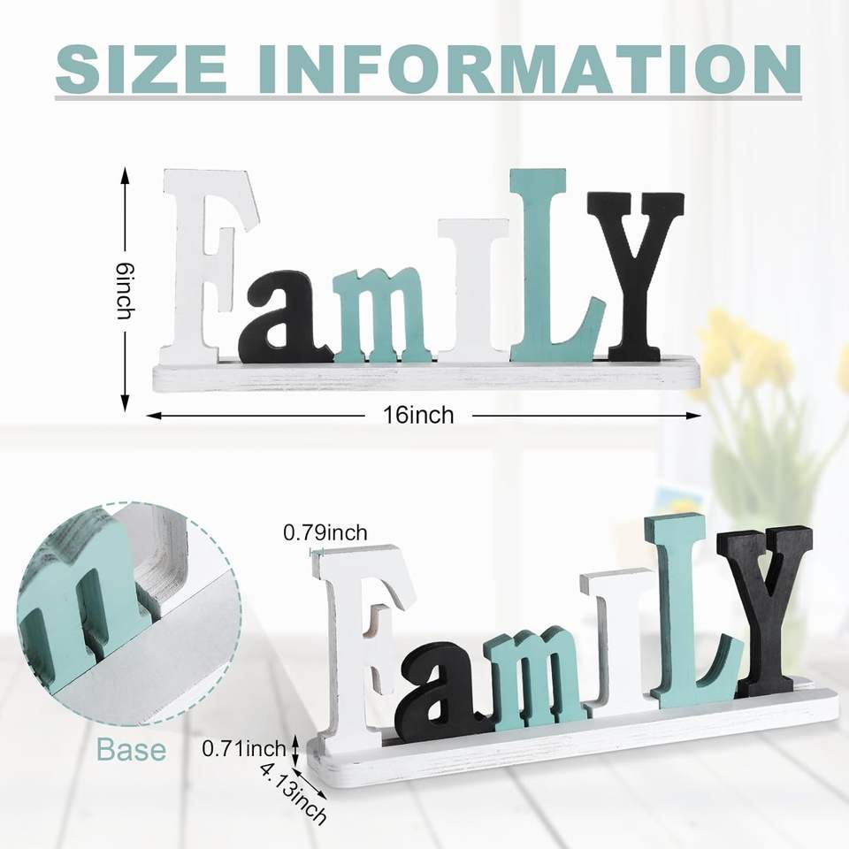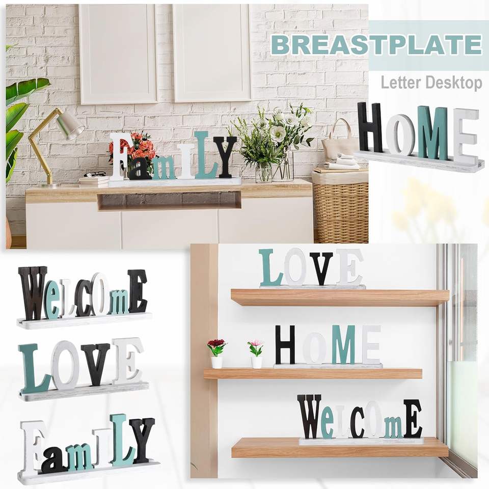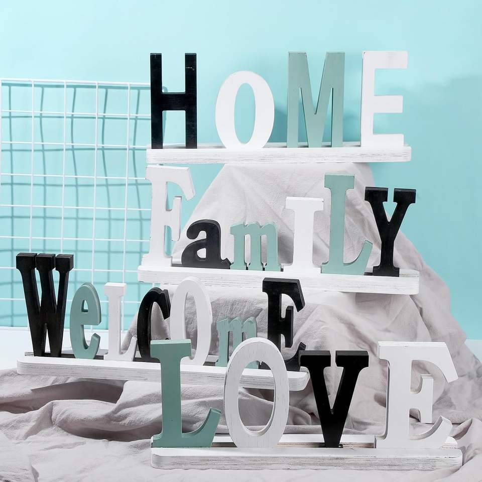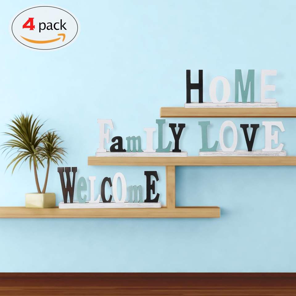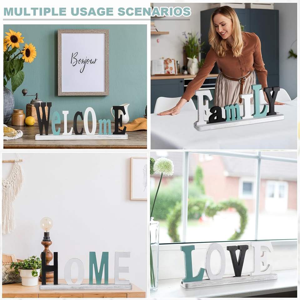 4 lettres en bois rustique polies, inscription « Love Family Home Welcome », lettres décoratives en bois, lettres en bois découpées autoportantes, couleur turquoise