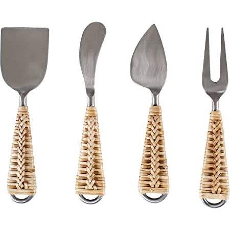 4 Pcs Manche en osier et couteaux à fromage en acier inoxydable Cutter Loop Handle Set de couteaux à fromage Set d'outils avec manche en bois de bambou