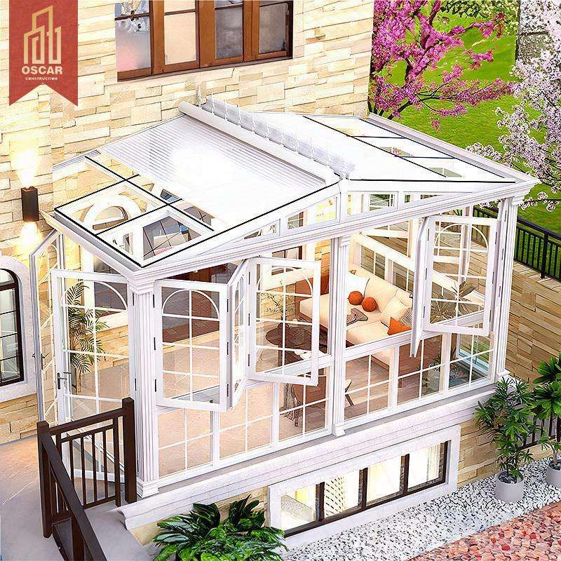 Série de structures en verre à toit triangulaire pour 4 saisons, véranda extérieure pour se baigner au soleil, se détendre et s'amuser
