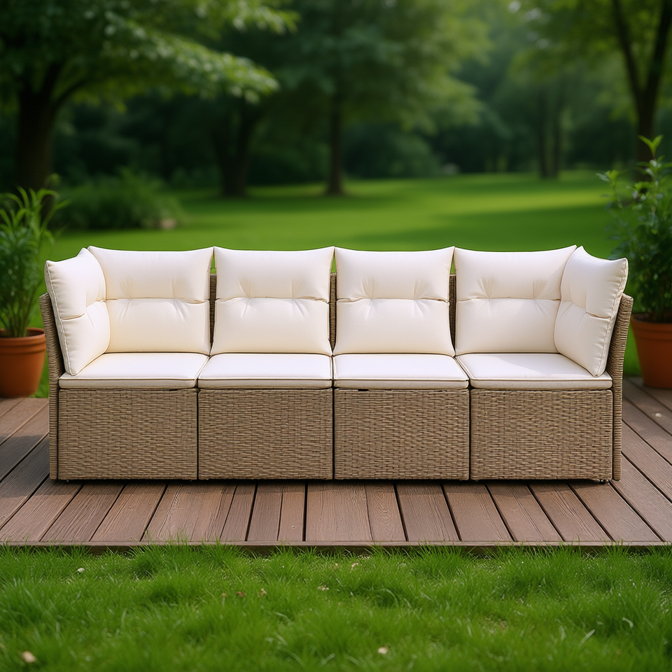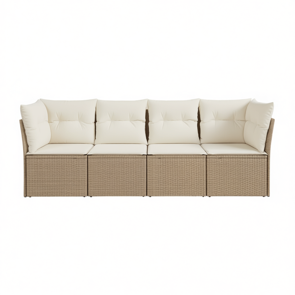 Canapé de jardin modulaire 4 places en rotin beige, mobilier d'extérieur, coussin imperméable, design contemporain