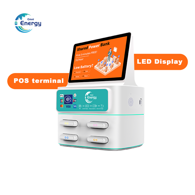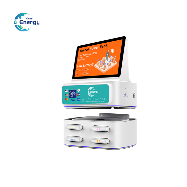 Distributeur Automatique de Batteries Externes à 4 Emplacements avec Terminal de Paiement PDV, Lecteur de Cartes, Kiosque d'Application de Location et Station de Recharge