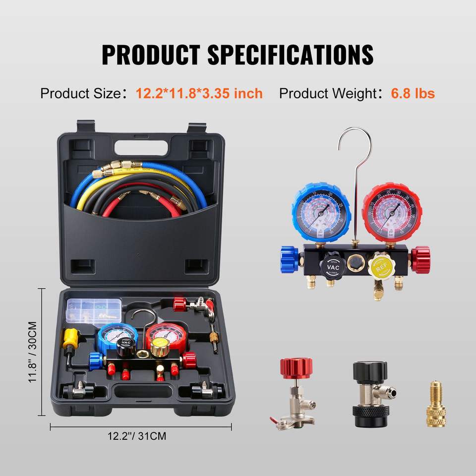 Kit de manomètres de collecteur AC 4 voies pour réfrigérants R134A R410A, avec flexibles de 1,5 m, raccords et robinet de décharge – Outils essentiels pour le chauffage, la climatisation et la ventilation (HVAC)