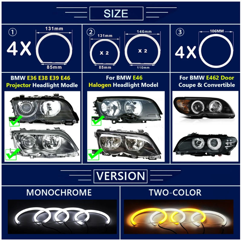 4 Anneaux Lumineux LED Coton SMD Bicolores Angel Eyes Sans Erreur pour Phares DRL BMW E30 E32 E34 E36 E38 E39 E46