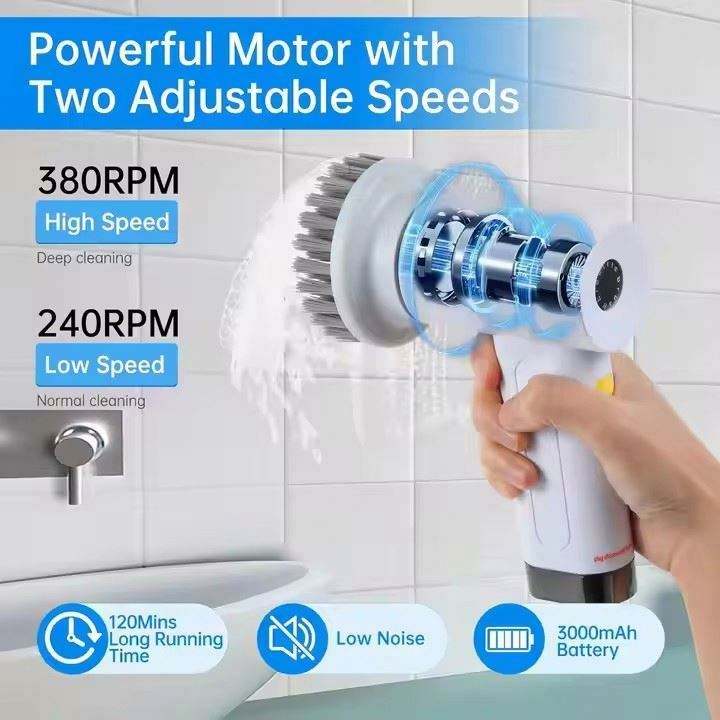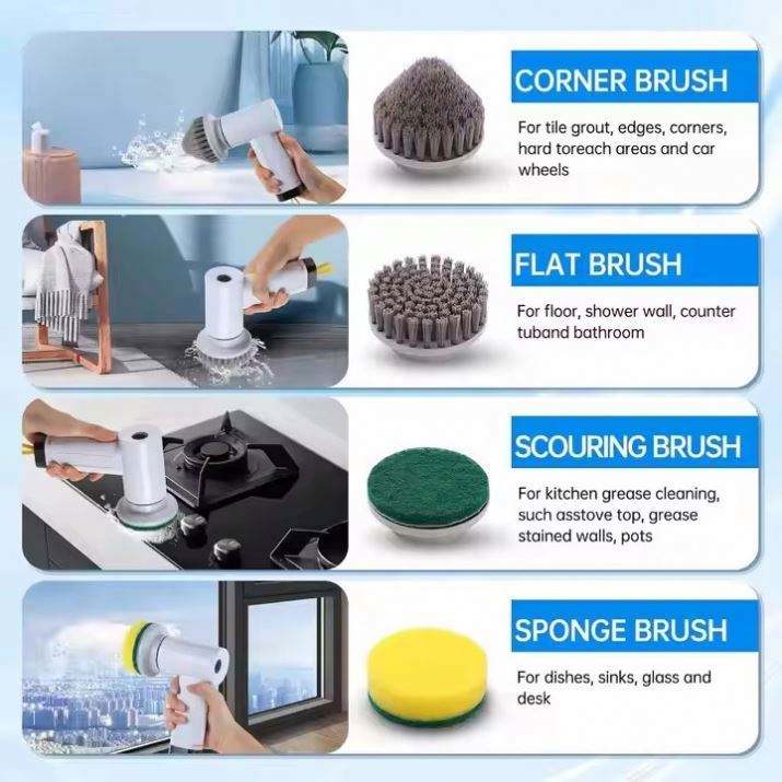 Brosse de nettoyage électrique portable 4-en-1 en plastique avec manche en acier et poils en nylon pour la cuisine, la salle de bain, la baignoire, l'évier et la vaisselle
