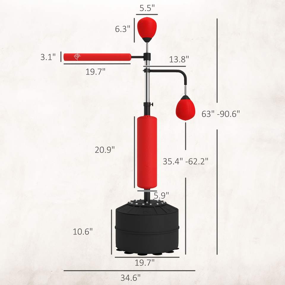 Machine d'entraînement de boxe 4-en-1 rouge avec support de sac de frappe, 2 speedballs, barre de relaxation rotative à 360 degrés, hauteur réglable et sac enveloppé de PU