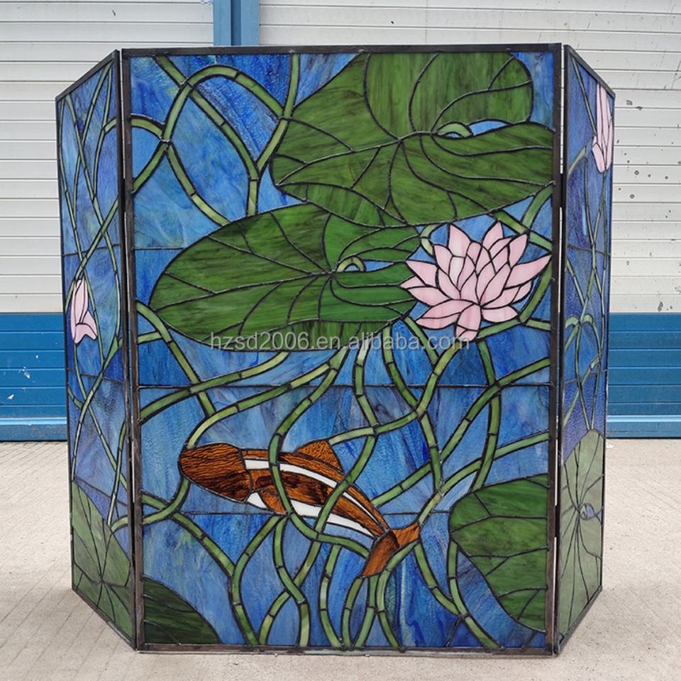 Écran de cheminée Tiffany en verre artistique décoratif, style campagnard européen, motif lotus et poissons, soudé à la feuille d'étain, 40''*28''