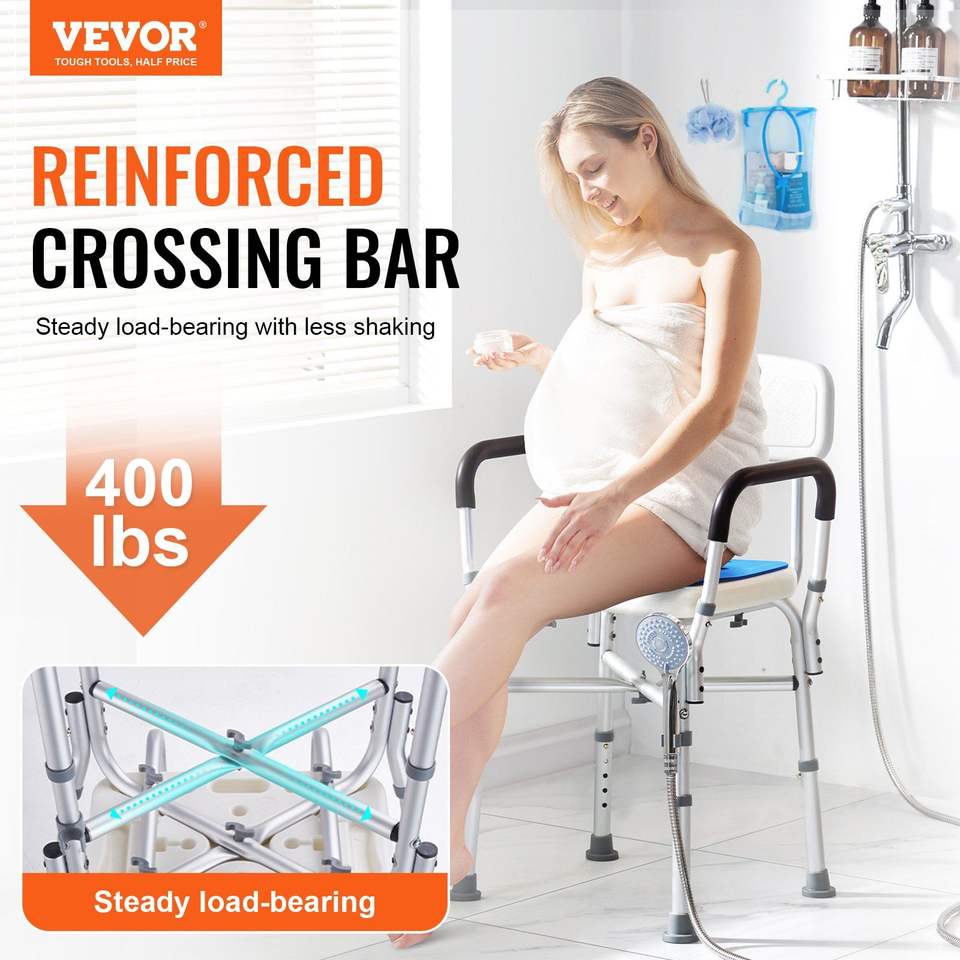 Chaise de douche rembourrée avec barre transversale et accoudoirs, capacité 400 lb, équipement de sécurité pour salle de bain, tabouret de douche rembourré pour le bain