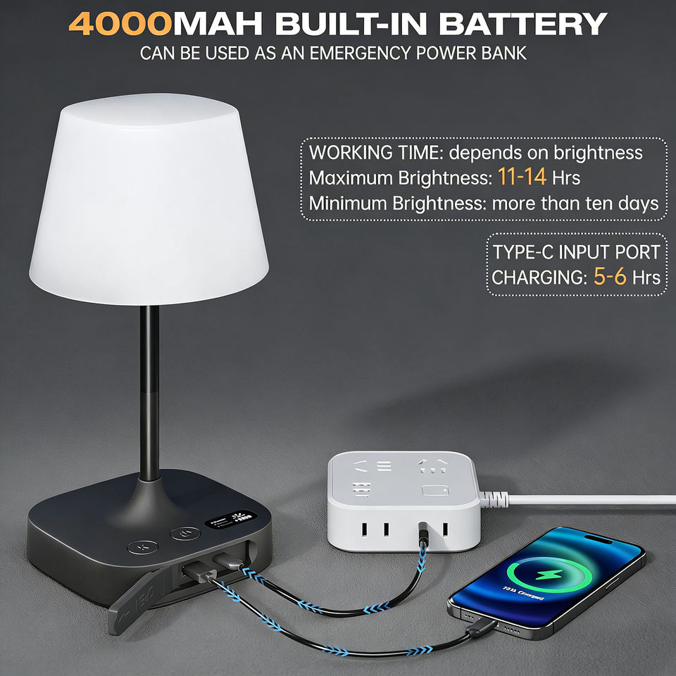 Lampe de table sans fil rechargeable 4000 mAh, lampe de douche étanche IP55, lumière LED de bain à luminosité réglable pour intérieur et extérieur