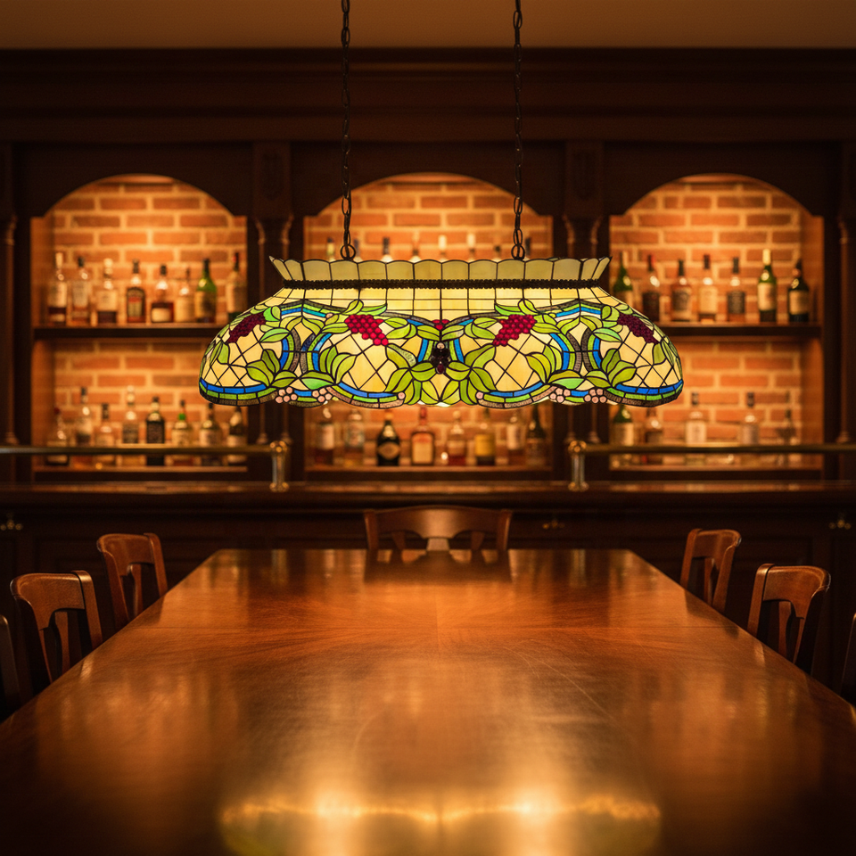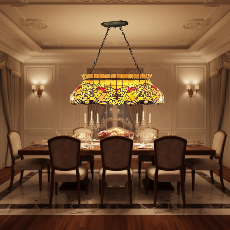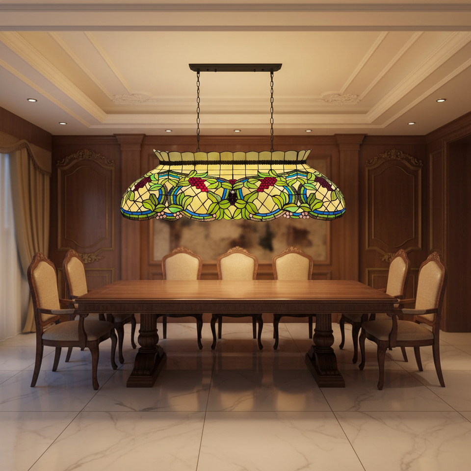 Lustre LED rectangulaire fait main en verre teinté motif vigne 42 pouces, blanc chaud doux 2700K, éclairage facile