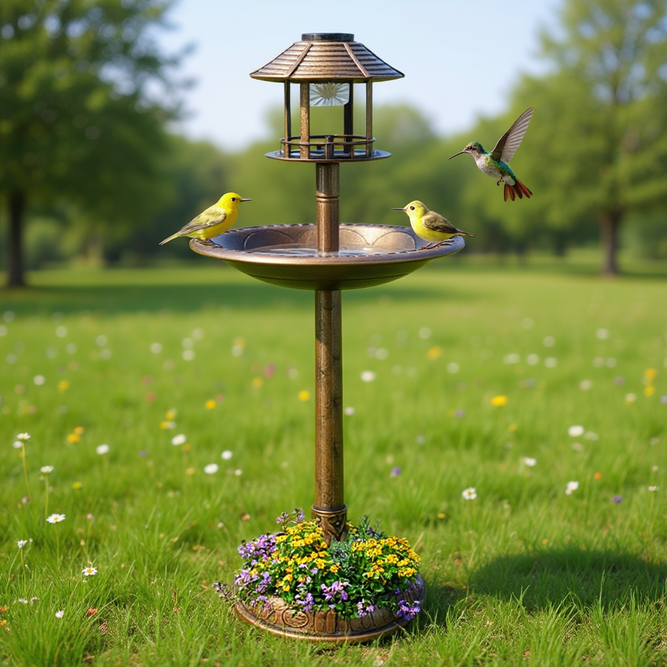 Mangeoire solaire pour oiseaux avec base en pot de fleurs, 42 pouces, pour l'observation des oiseaux dans la cour, style traditionnel en métal, pour oiseaux sauvages