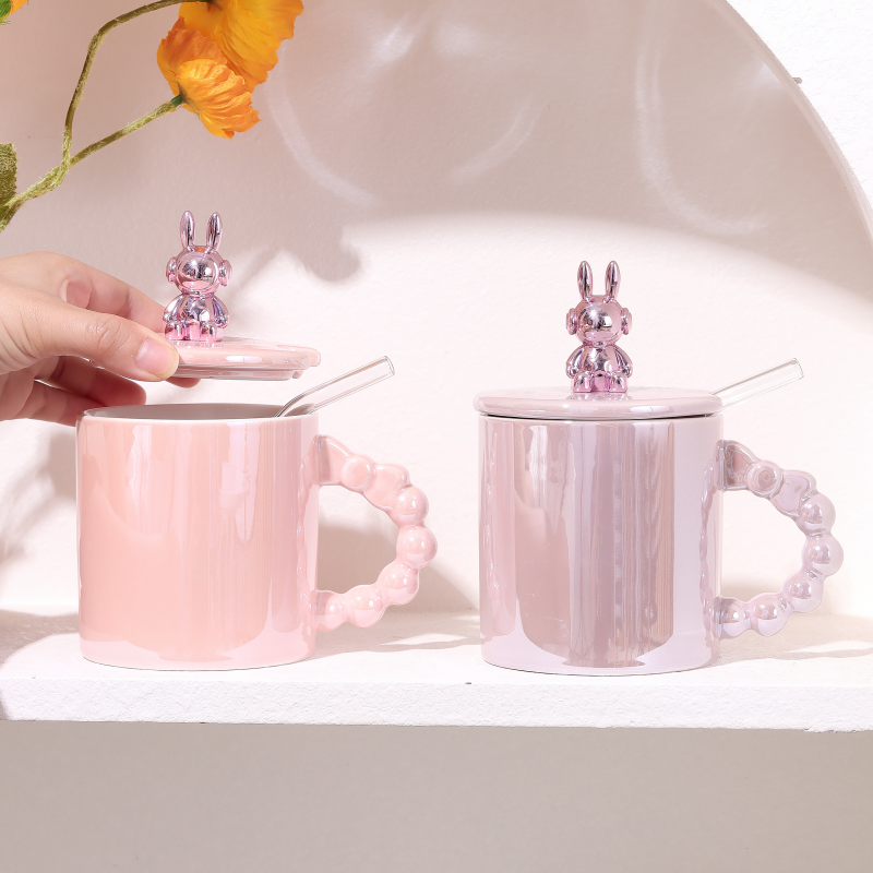 Tasse en céramique 3D motif Ours et Lapin 420 ml, en porcelaine écologique avec couvercle et paille, idéale pour café et herbes, parfait comme cadeau