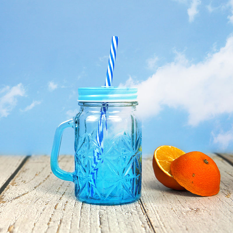 Pot de maçon en relief transparent de 430ml pot de verre de paille de boisson froide tasse de fontaine d'eau de 16 oz avec couvercle et poignée en métal