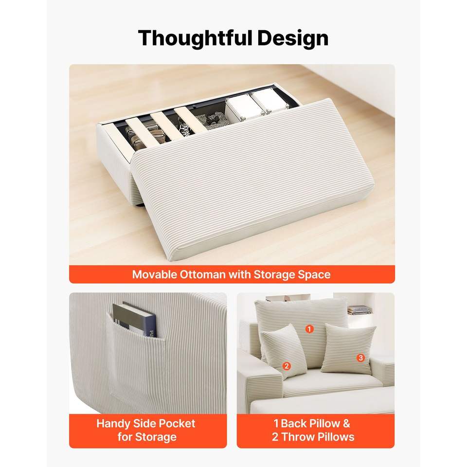 Chaise longue modulaire d'intérieur sans structure de 44 pouces, chaise de lecture surdimensionnée en velours côtelé avec coussins et accoudoirs