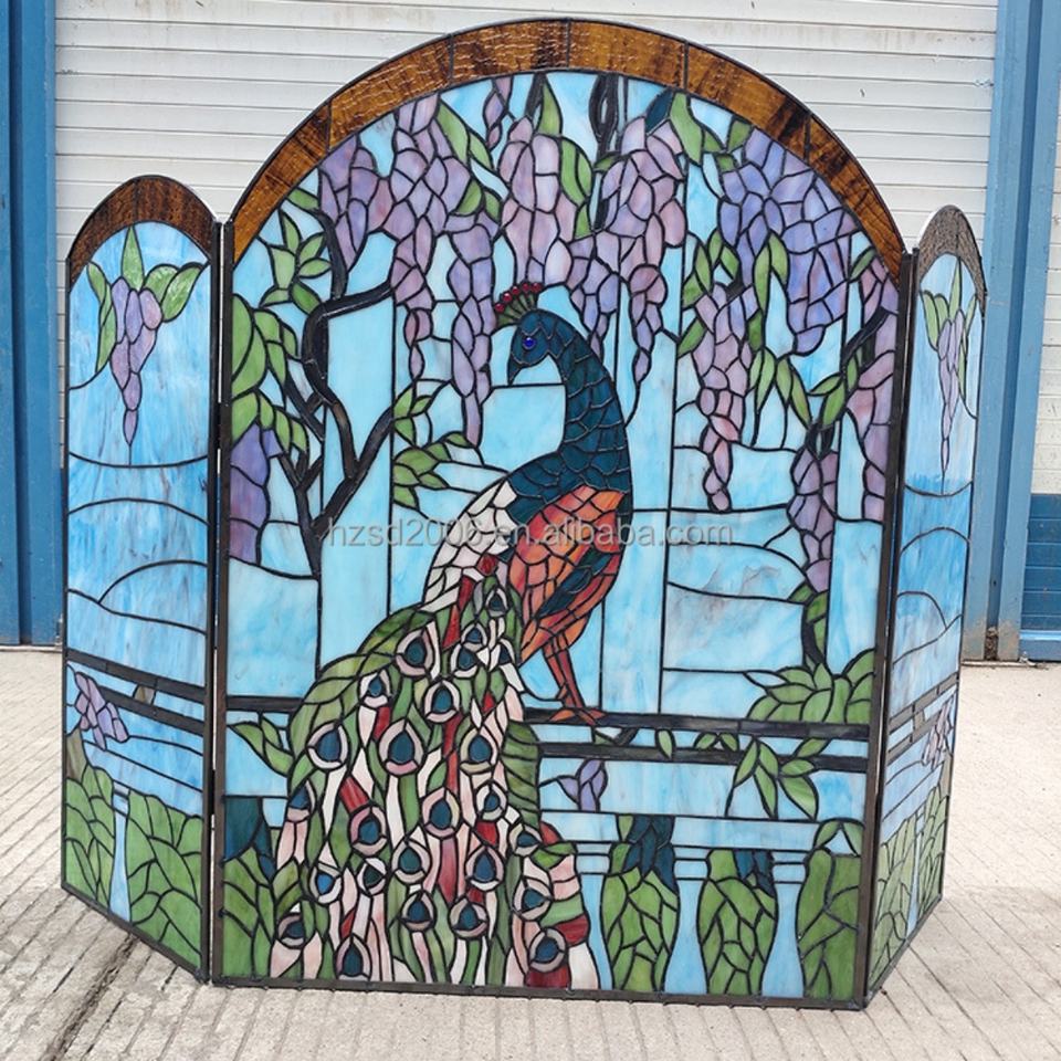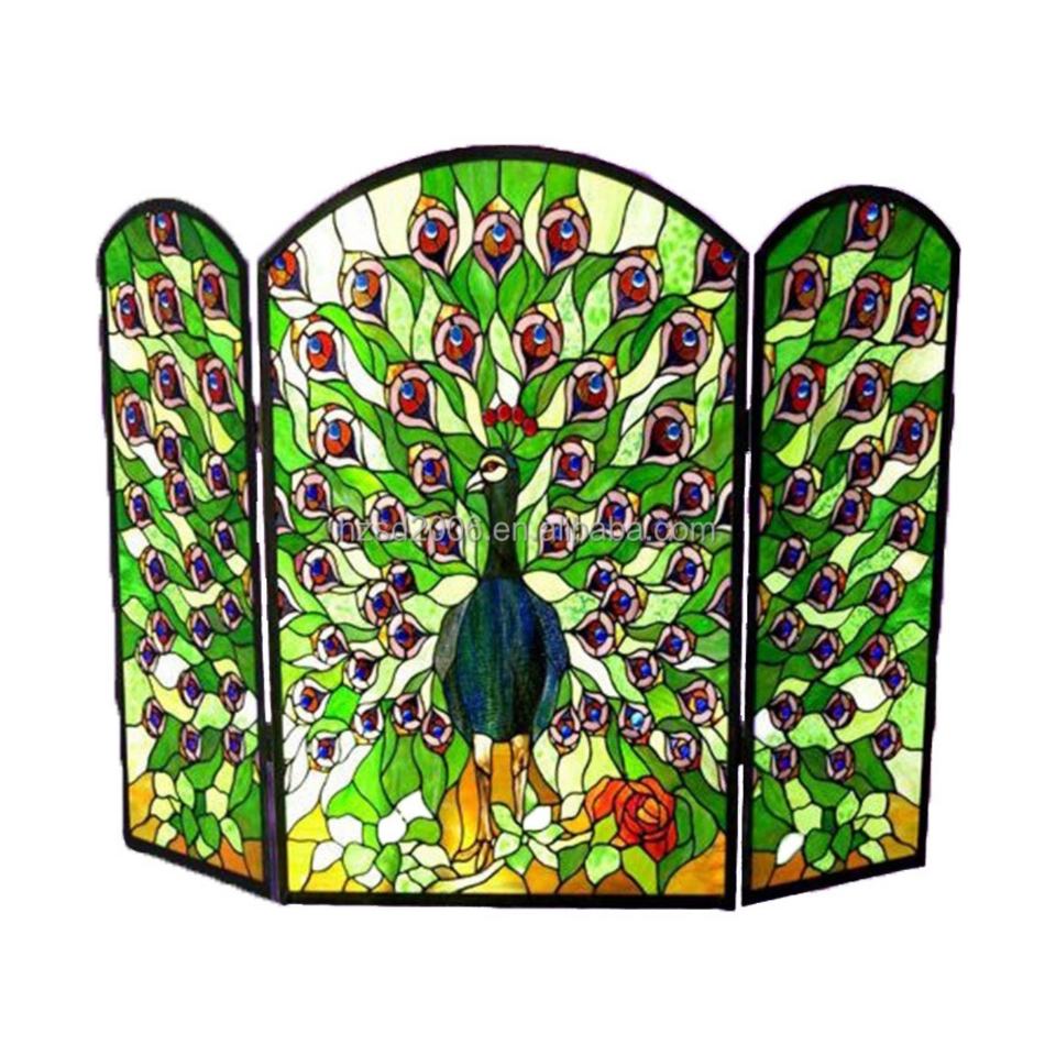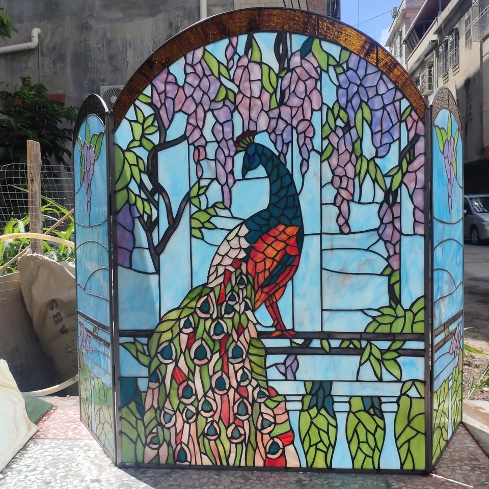 Écran de cheminée en verre massif 44''x32'' avec motif paon, en verre teinté soudé à la feraille pour la décoration intérieure