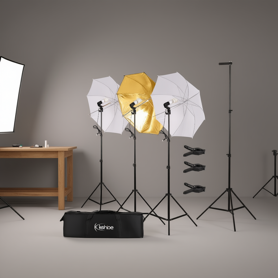 Kit d'éclairage de studio Kshioe 45W avec parapluie translucide doré, support et fond pour la photographie