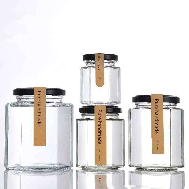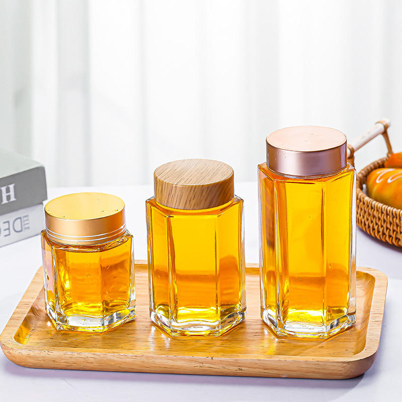 45ml 60ml 85ml 100ml 180ml 280ml 380ml 500ml 730ml Hexagone Cuisine Vide Miel Confiture Cornichons Bocal en Verre pour Stockage Scellé des Aliments