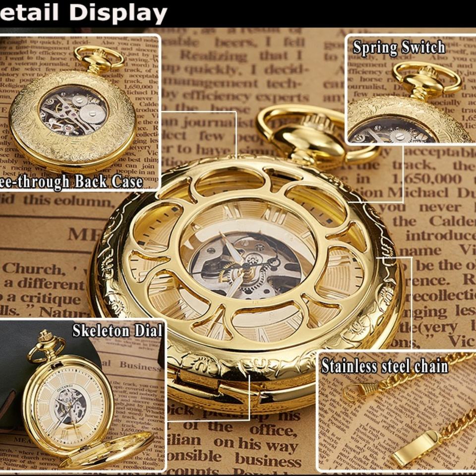 Montre de poche 45 mm personnalisable, rétro, avec fond transparent, automatique, mécanique, avec chaîne de ceinture en acier inoxydable
