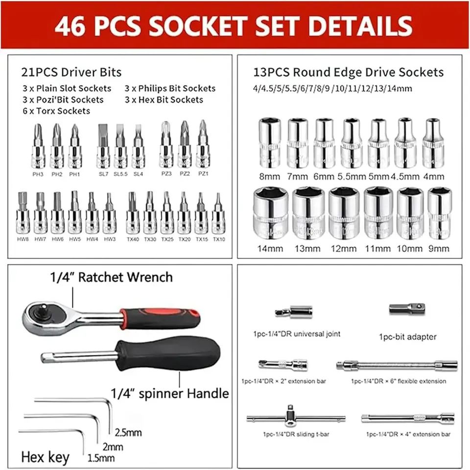 Kit d'outils de réparation automobile 46 pièces : Clé dynamométrique à cliquet, Clé à molette, Tournevis, Jeu de douilles, Outils combinés pour réparation de vélos et automobiles
