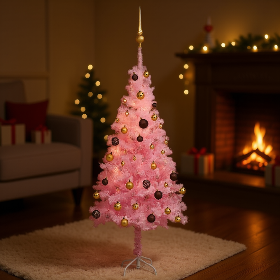 Sapin de Noël artificiel rose en PVC pré-éclairé de 47,2 pouces avec un ensemble de boules, LED blanc chaud, arbre de Noël sur pied pour intérieur