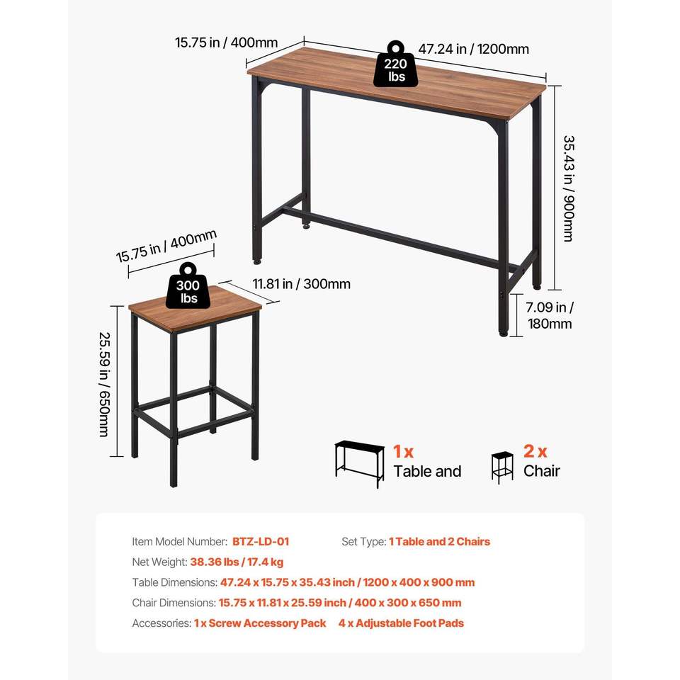 Ensemble de tables de bar de 47 pouces, 3 pièces, table de bar et chaise avec design à bords arrondis, table de pub rectangulaire et deux tabourets, ensemble de meubles