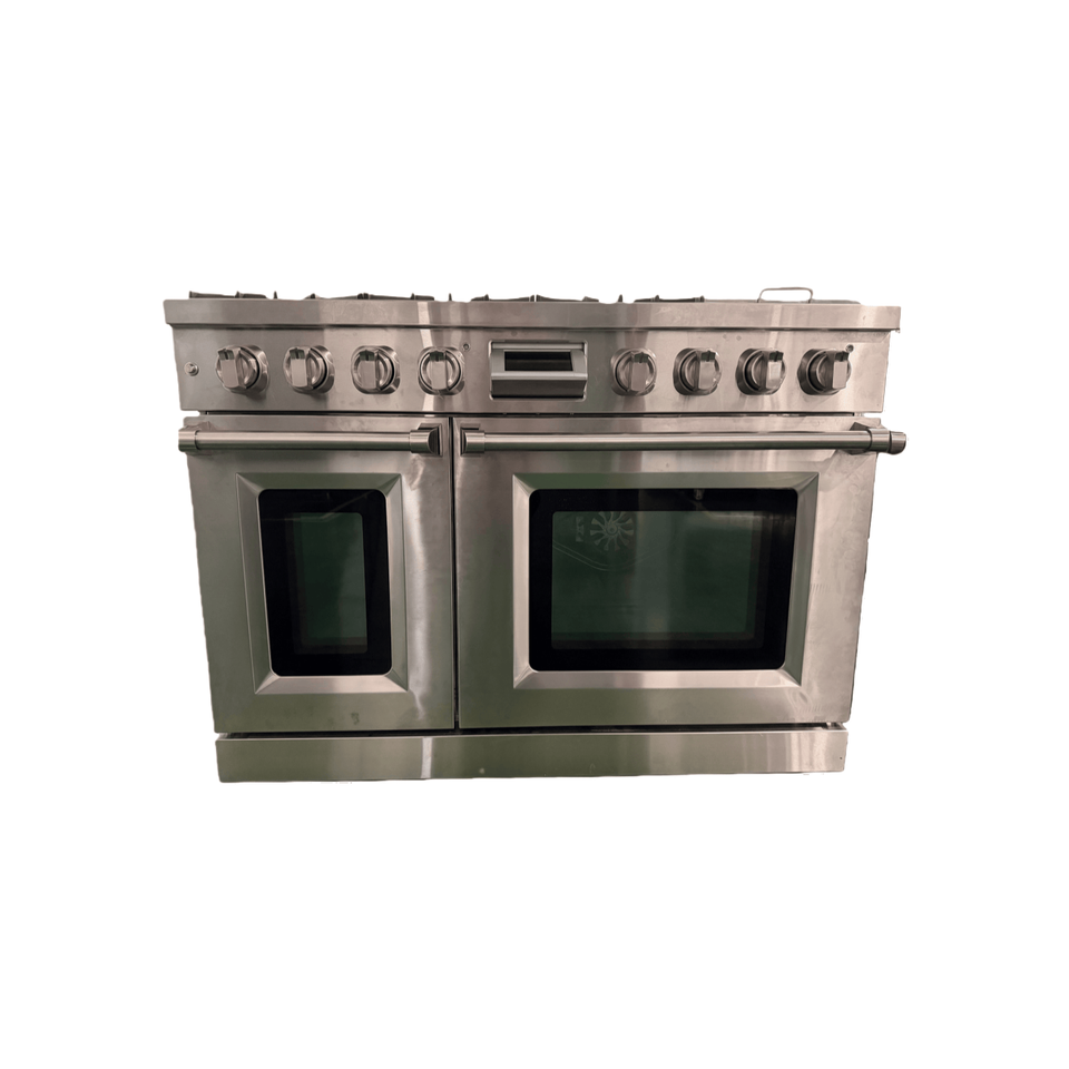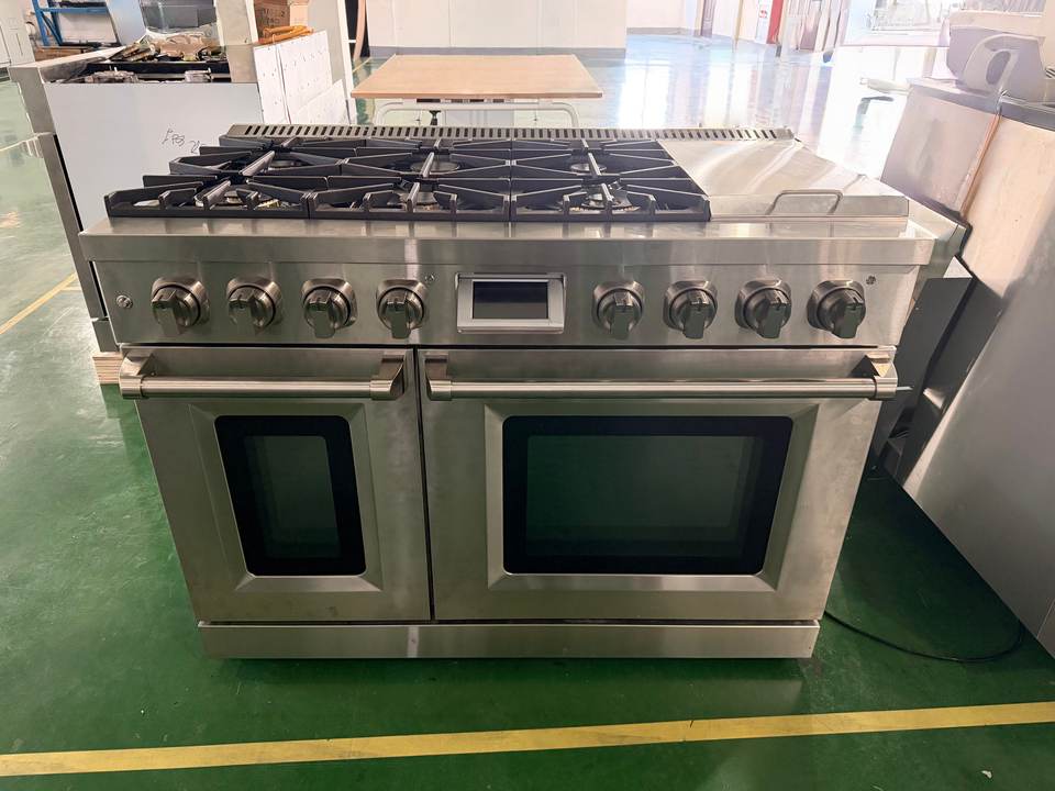 Four à gaz de 48 pouces, cuisinière à gaz professionnelle à 6 brûleurs avec friteuse à air et plaque chauffante en acier inoxydable et panneau inclinable