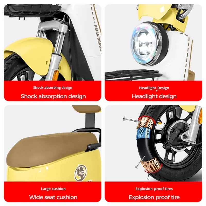 Scooter électrique à cadre en acier à haute teneur en carbone 48V, batterie au plomb-acide, conception à deux roues, moteur à moyeu arrière, autonomie de 60 km