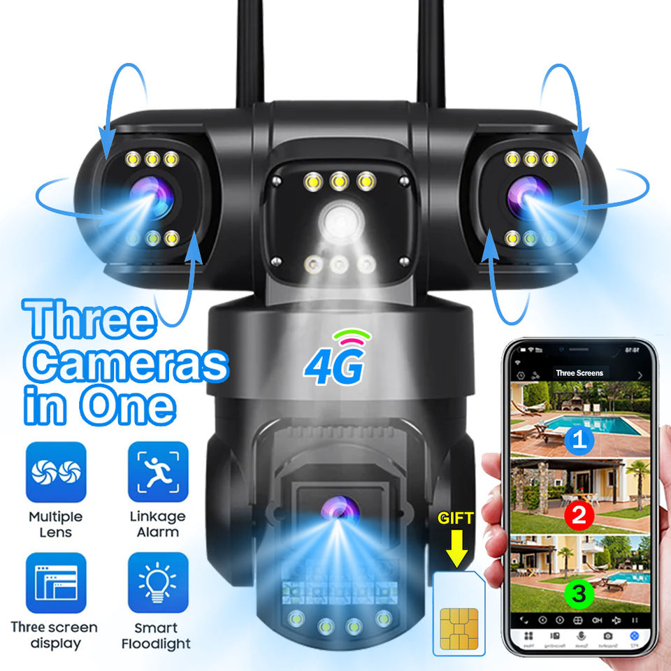 Caméra IP 4G 12MP à triple objectif CMOS, vision nocturne IR, PTZ, moniteur à trois écrans, caméra de sécurité domestique, magasin, chantier extérieur