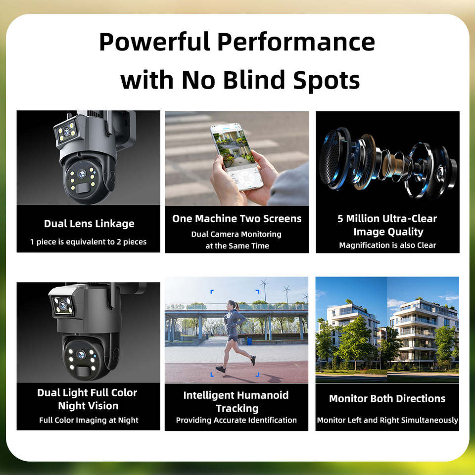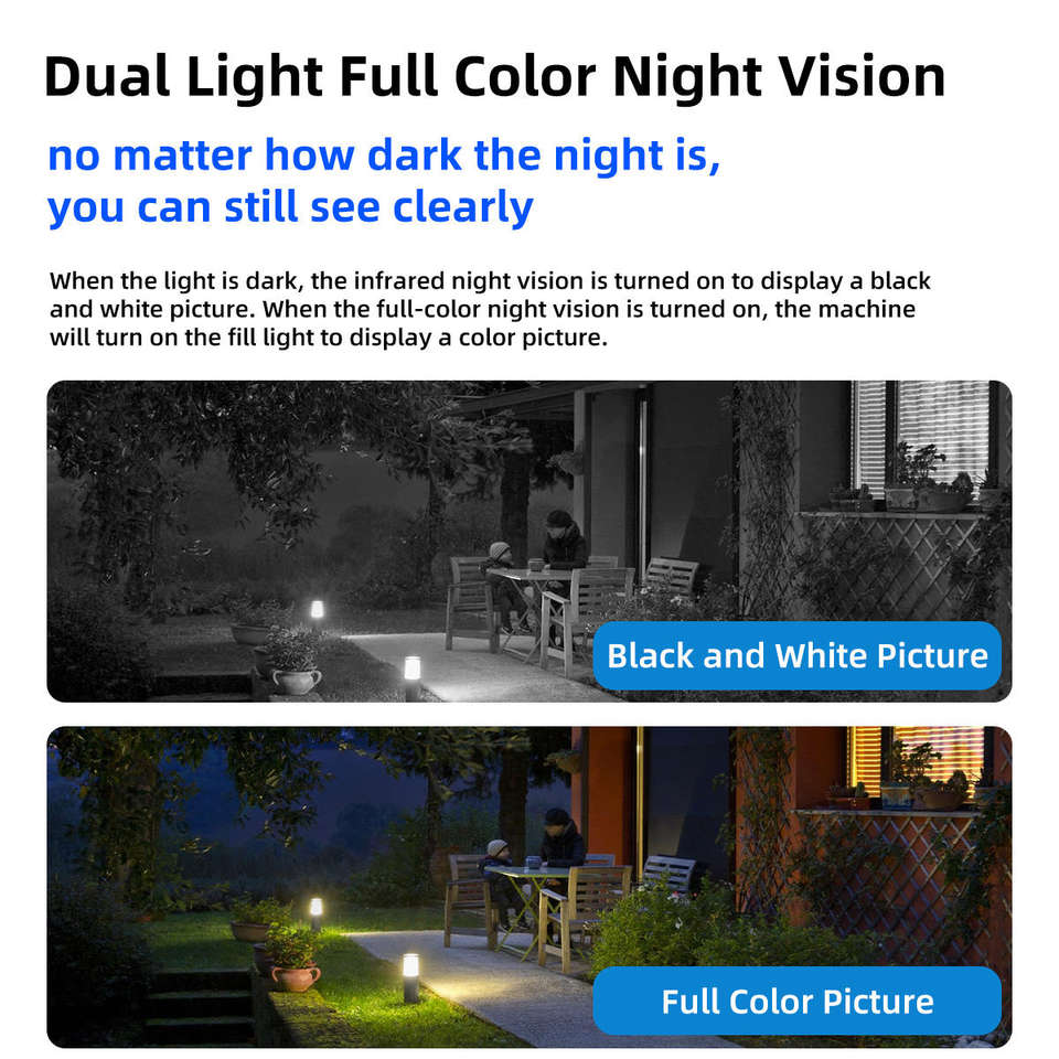 Fonction:Audio bidirectionnel, PAN-TILT, Vision nocturne, Imperméabilisez/protégez contre les intempéries, Couleur pleine, Détection de mouvement