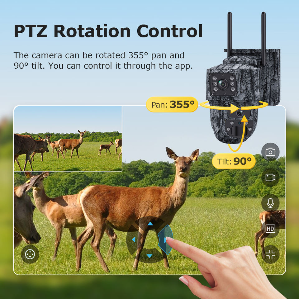 355°, AI Detection: Human and vehicle recognition with auto tracking, Night Vision: Four white LEDs and eight infrared LEDs with effective range up to 25 m, GPS Module: Integrated GPS for geofencing and location tagging, Audio: Two-way communication via built-in microphone and speaker, Weatherproof Rating: IP66 housing with -20 °C to +60 °C operating range, Storage: MicroSD slot supporting cards up to 128 GB plus cloud storage support