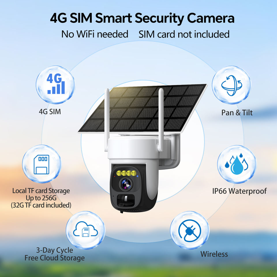Caméra de sécurité extérieure sans fil PTZ solaire 4G sans carte SIM 2K, stockage 32 Go, détection de mouvement PIR, audio bidirectionnel, batterie intégrée, IP66