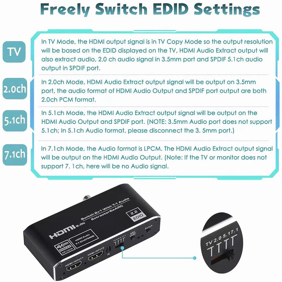 Commutateur HDMI 4K 120HZ 2 ports 2 entrées 1 sortie Commutateur HDMI2.0b Extracteur audio avec EARC 7.1CH Optique Toslink HDCP2.3