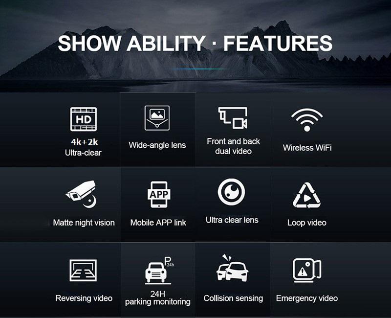 Vision nocturne, WDR, Télécommande, Couleur pleine, G-sensor, MODE park, Enregistrement en boucle, Intégré WiFi, Contrôle de l'application, GPS INTÉGRÉ, D'urgence Accident Serrure, Batterie Intégrée